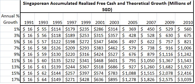 If these free cash flows averaged annual growth of only 1%, assets would still amount to more than Temasek and the GIC combined. If annual growth was the GIC average of 7%, Singapore would still be sitting on more than $1 trillion SGD rather than the current estimate of around $500 billion. A 10% rate of return would leave Singapore with $1.4 trillion SGD. If public surpluses and borrowing were invested and returned even a balanced portfolio average, the current assets managed by public bodies in Singapore would truly be staggering.